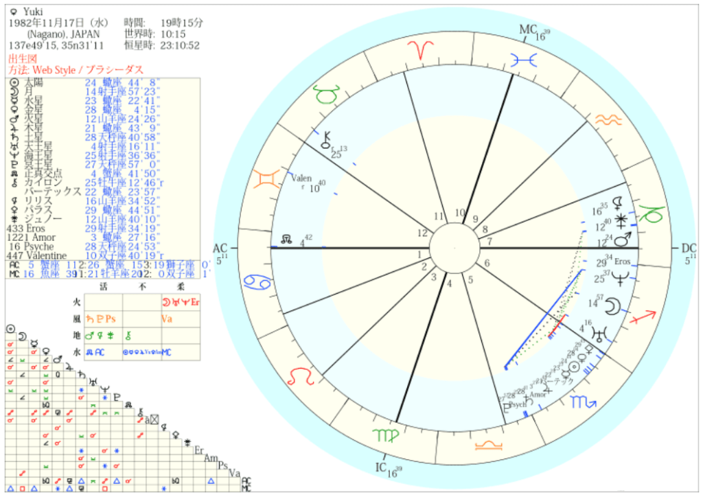このページを見に来て下さっている方の中で、ホロスコープ(一般的に占星術と呼ばれるもの)について詳しい方がどのくらいいらっしゃるかは分かりませんが、私は面白い方に出会うとお誕生日や生まれた場所を聞いてはその方のホロスコープのチャートを見るのが好きです。なぜならチャートからある程度その方の性格のベースが分かるからです。「分かる」という言葉より「想像がつきやすい」と言った方がいいかもしれません。